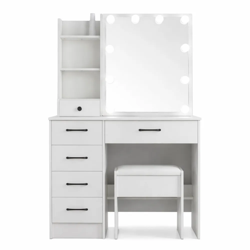 Tavolo da trucco con specchio illuminato e sgabello, 6 cassetti e ripiani multipli, bianco